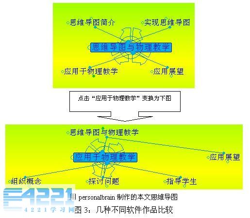 计算机已经在许多方面取代了"纸+笔",在制作思维导图上,计算机也以它的操作快捷、图象形式多样和容量大的特点显示了比"纸+笔"工具的优势。现在,制作思维导图的软件很多,如inspiration、mindmanager、personalbrain、brainstorm等,这些软件互有优缺点,在实际应用中可以根据需要进行选择。图3是利用不同软件制作的本文结构图,从中可以比较出它们的表达方式的特色。这些软件都非常容易掌握,因此不仅是教师可以使用,学生也可以使用,为学生学习又提供了新的工具。