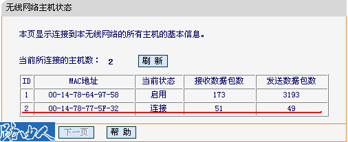 (4)这时进入路由器无线参数-主机状态,可以看到已连接的网卡MAC地址;在主机状态页面,表里第一个显示的是无线路由器的MAC地址。