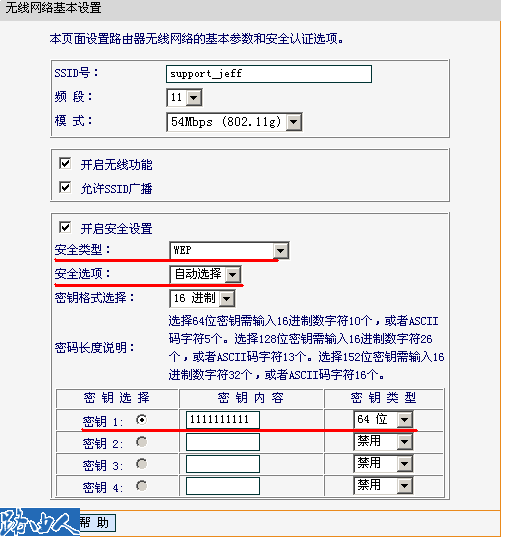 打开路由器管理界面,无线参数->基本设置,安全选项选择自动选择,自动选择就是在开放系统和共享密钥之中自动协商一种,而这两种的认证方法的安全性没有什么区别;密钥格式选择选择16进制,还有可选的是ASCII码,这里的设置对安全性没有任何影响,因为设置单独密钥的时候需要16进制,所以这里推荐使用16进制。