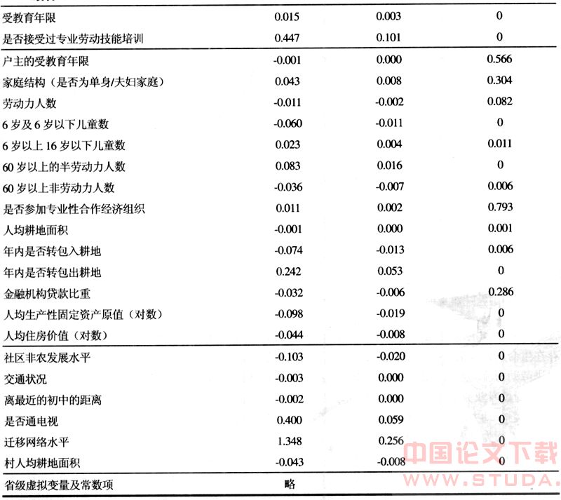 最后,外出经验应该显著地有助于家庭成员做出当年是否外出的决策,遗憾的是,在目前的住户调查中没有足够的外出经验方面的数据可用。