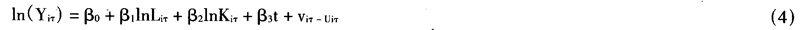 根据本文的研究目的和所用数据特征,本文以Battese and Coelli提出的随机前沿生产函数模型为蓝本。该模型的最大特点就是利用面板数据可同时对前沿函数和技术无效率函数的参数进行估计。Battese and Coelli的随机前沿生产函数为: