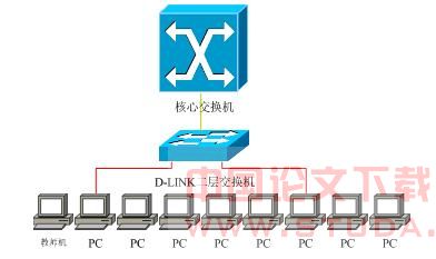 图2是典型的校园网机房的网络结构,上连核心交换机,二层交换机PC机和教师机,图中采用D-LINK交换机,机房内PC不用相互访问,只需同教师机和通过核心交换机访问校内外资源,配置如下:
